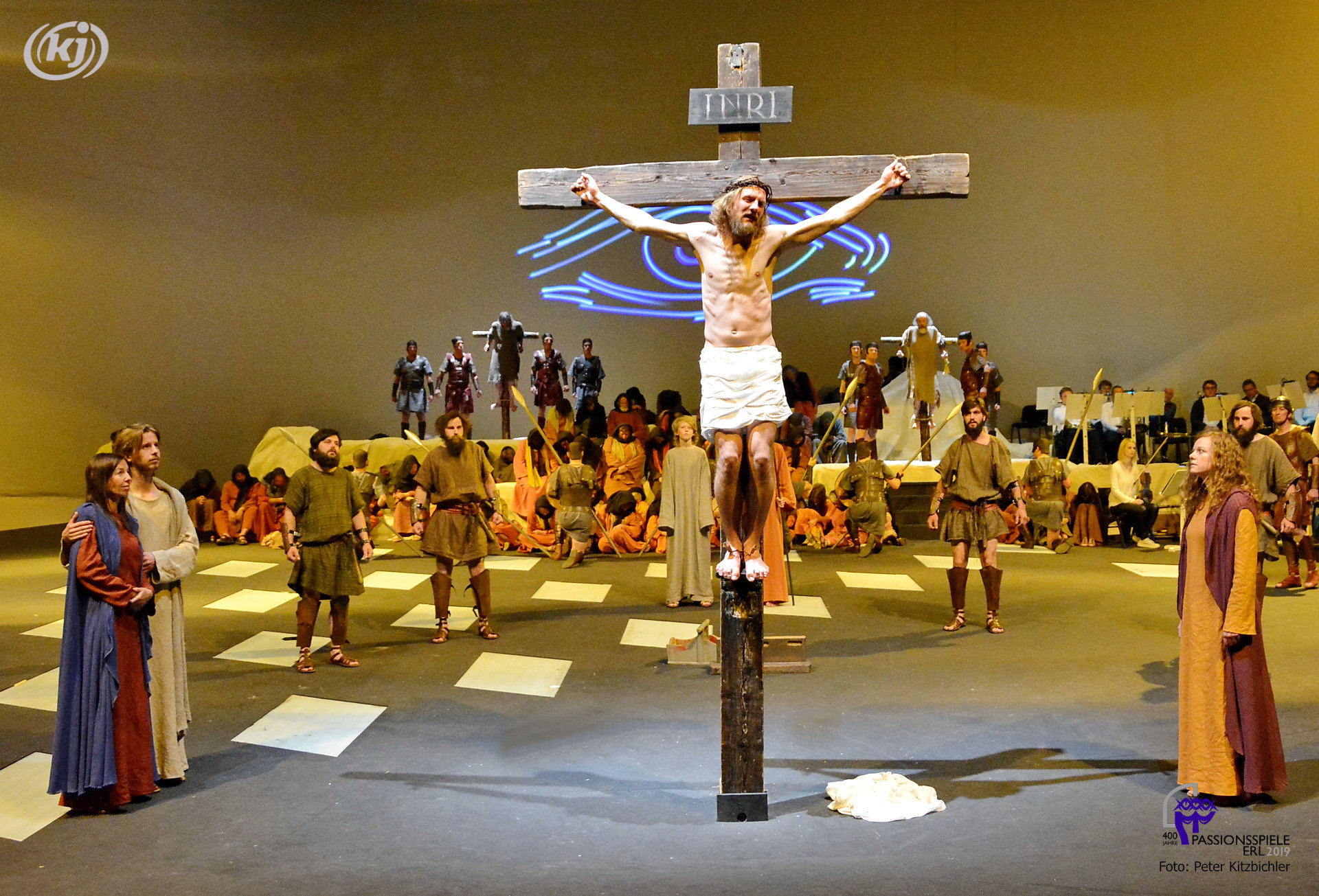 So kamen sie an den Ort, der Golgota genannt wird, das heißt Schädelhöhe. Und sie gaben ihm Wein zu trinken, der mit Galle vermischt war; als er aber davon gekostet hatte, wollte er ihn nicht trinken. Nachdem sie ihn gekreuzigt hatten, verteilten sie seine Kleider, indem sie das Los über sie warfen. Über seinem Kopf hatten sie eine Aufschrift angebracht, die seine Schuld angab: Das ist Jesus, der König der Juden.
